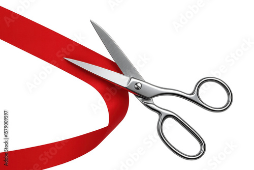 Shiny metal scissors cutting a bright red ribbon on a transparent background, ideal for grand openings or ceremonies
