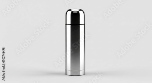 Shiny metal thermos with a sleek cylindrical design stands against a plain white backdrop, perfect for showcasing its modern aesthetic and practical use