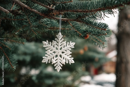 Shiny plastic snowflake ornament hanging from evergreen tree branch, surrounded by lush green needles, creating a festive atmosphere for New Year and Christmas celebrations