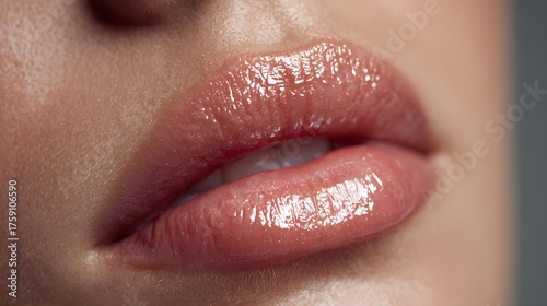 Shiny, plump lips with a hint of moisture are reflected in light.
