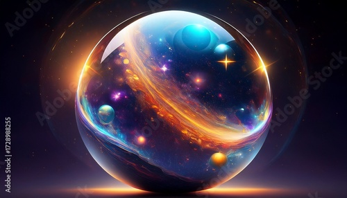 shiny reflective marble with the cosmos sun stars planets and galaxies inside a glass globe orb bowling ball light mirror sphere in space