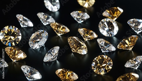 Shiny round diamonds on black background, luxury brilliants sparkle on dark desk, white gemstones with reflections. Concept of jewel, jewelry, gem, gift, natural precious stone, crystal
