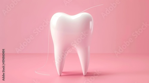 Shiny White Tooth with Dental Floss on Pink Background - Oral Hygiene and Dental Care Concept