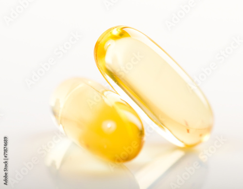 shiny yellow vitamin e fish oil capsule on white background