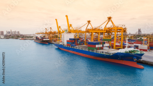 Ship container from sea port and cityscape background for import export or transportation concept.