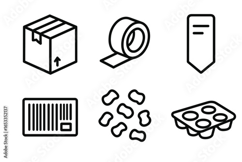 Shipping and packaging icons: box, tape, barcode, arrow, label, bubble wrap