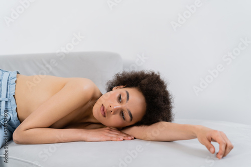Shirtless african american woman lying on couch on grey background.