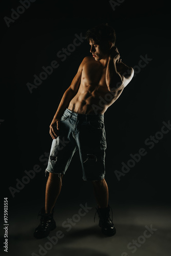 Shirtless athletic man posing in dark lighting wearing ripped denim shorts, showcasing his muscular physique for a fitness and fashion photo shoot.