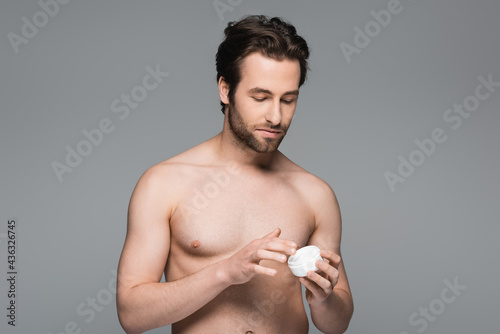 shirtless man applying cosmetic cream isolated on grey.