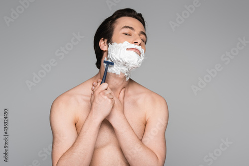 shirtless man with white foam on face shaving with safety razor isolated on grey.