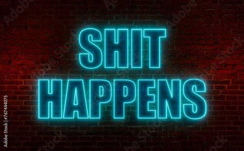 Shit happens. Brick wall at night with the text "Shit happens" in blue neon letters. Incident, happening, negative emotions. 3D illustration