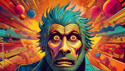 shocked and frightened facial expressions. showing a sense of panic or confusion. The background is full of bright colors and moving lines that create a dynamic effect, as if something intense