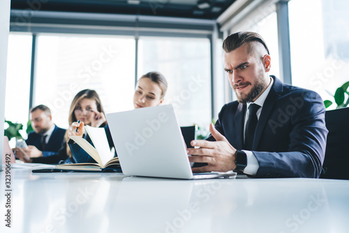 Shocked businessman working on computer at table