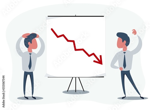 Shocked man in a suit watch on the board with a declining arrow. Falling indicator of economic prosperity. Businessman has the shock of rapid decline in stocks isolated on white background.