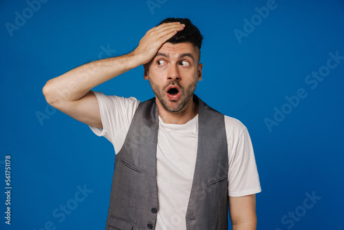 Shocked man screaming and grabbing his head while standing isolated over blue background