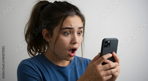 Shocked woman looking at her phone, surprised by what she is seeing.