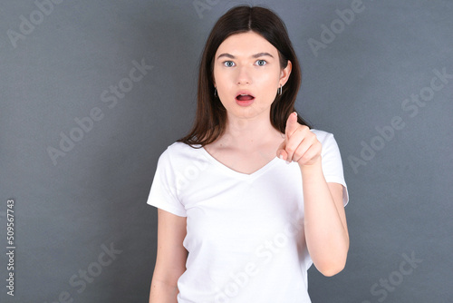 Shocked young beautiful Caucasian woman wearing white T-shirt over studio grey wall points front with index finger at camera and. Surprise and advertisement concept.