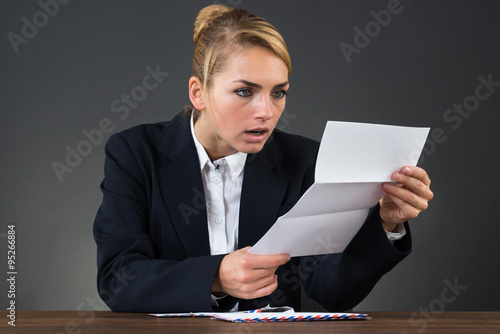Shocked Young Businesswoman Reading Letter At Desk