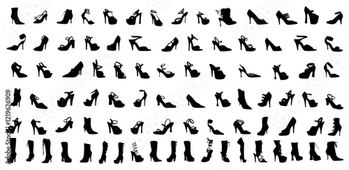 Shoe silhouettes collage: A stylish collection of various shoe silhouettes, showcasing diversity in fashion and footwear styles from elegant high heels to sturdy boots.