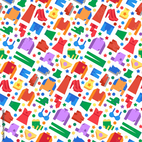 Shoes and clothes textile objects seamless pattern with cloth, fabric, shoe, trousers, fiber, jeans, sweater. Ornament for printing on fabric, cover and packaging. Vector isolated on white