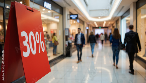 Shoppers engaged in lively retail activity under a vibrant red sale sign in a modern shopping mall