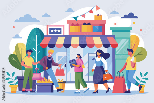 Shoppers enjoy a vibrant day at a customizable flat filled with various products and cheerful customers, Shopping Customizable Flat Illustration