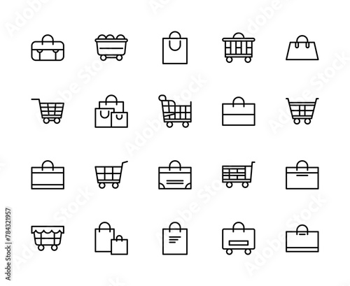 Shopping bag and basket vector linear icons set. Contains such icons as shopping bag, package, purchases, shopping cart and more.