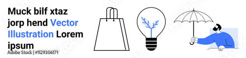 Shopping bag, light bulb with plant, man holding umbrella. Ideal for e-commerce, sustainability, protection, innovation, lifestyle marketing creative thinking. Landing page