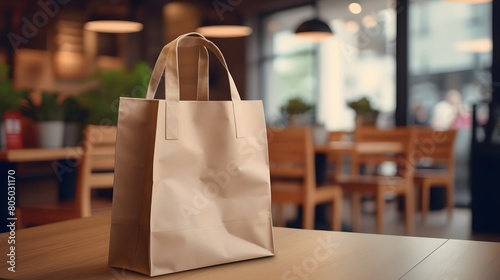 Shopping bag mockup in a cozy cafe setting, warm interior,