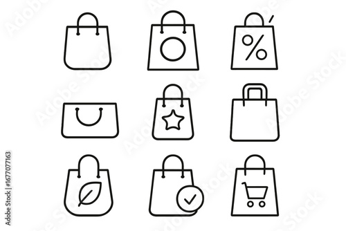 Shopping bag vector line icon set. E-commerce and retail outline pictograms. Contains sale, discount, checkout, eco friendly, favorite, and add to cart symbols for web.