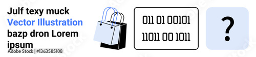 Shopping bags, binary code square, and question mark representing e-commerce, digitalization, technology, uncertainty, problem-solving, commerce innovation. Ideal for e-commerce ideas flat landing