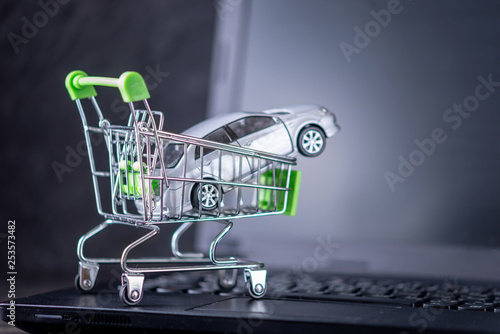 Shopping basket with car on laptop keyboard on dark background. Concept of online shopping vehicles on the Internet