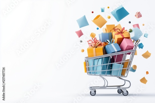 Shopping cart filled with colorful wrapped gifts and ribbons, with a bright white background. Concept of shopping, celebration, and giving.