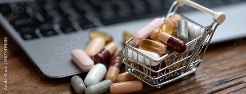 Shopping cart filled with various vitamins and supplements next to a laptop on a wooden surface in a home office setting