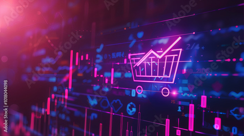 Shopping cart in the market. ecommerce cart on the stock market trading growth graph, arrow chart.