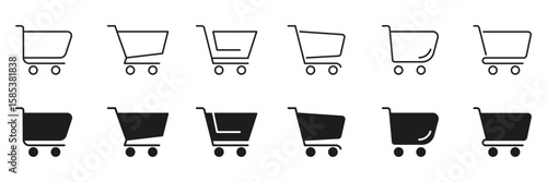 Shopping Cart Line And Solid Icon Set. E-Commerce, Online Shopping, And Retail Marketplace Outline And Silhouette Symbol Collection. Digital Commerce And Consumer Goods. Isolated Vector Illustration