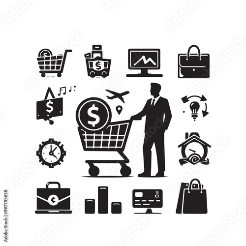 "Shopping Cart with Bags Illustration in Black and White Vector Art"
