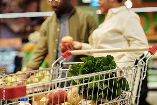 Shopping cart with fresh fruits and vegetables against young couple choosing apples while standing by display in grocery store