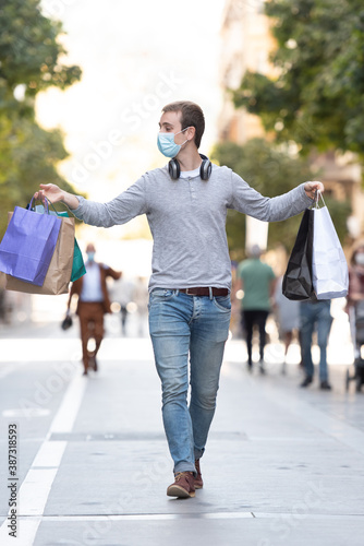 Shopping during Coronavirus concept. A handsome boy walking through a pedestrian street holding his shopping bags and wearing a face mask.