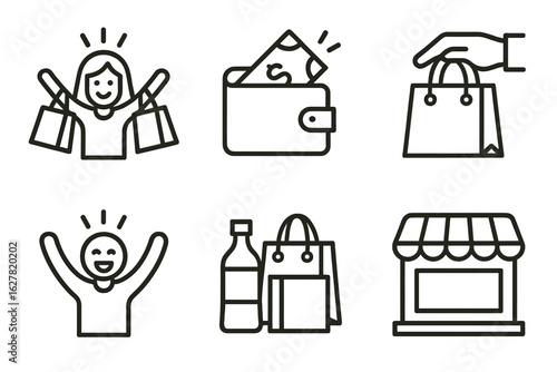 Shopping icons: happy people, wallet, bags, storefront in line style