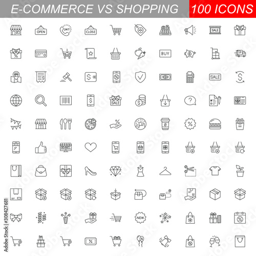 SHOPPING vs E-COMMERCE line thin icons set. Vector illustrations collection EPS10.