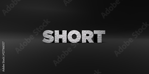 SHORT - hammered metal finish text on black studio - 3D rendered royalty free stock photo. This image can be used for an online website banner ad or a print postcard.