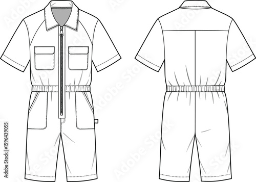 Short sleeve jumpsuit technical fashion sketch, front and back flat template, CAD drawing vector illustration for apparel design presentation