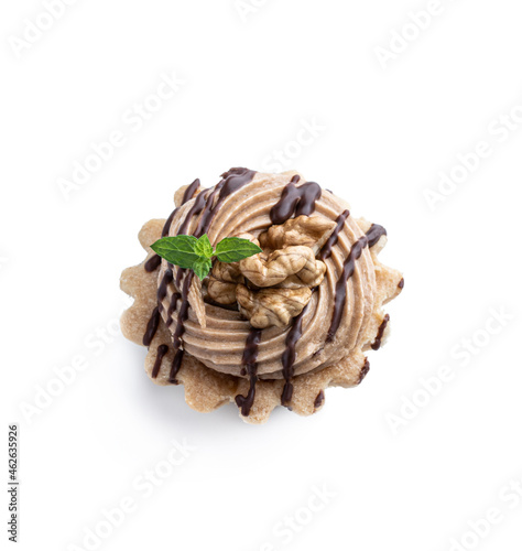 Shortcrust pastry with whipped cream custard and walnut isolated on white