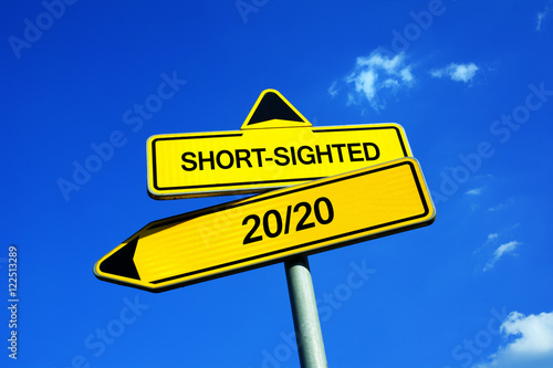 Short-sighted vs 20/20 - Traffic sign with two options - perfect eye vision or near-sightedness. No vision correction vs laser surgery and wearing glasses and contact lenses