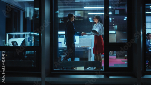 Shot from Outside: Two Businesswomen Meet and Shake Hands in Office. Managers Standing by the Window and Looking at a Tablet Computer. Employees Talk about Financial and Business Development.