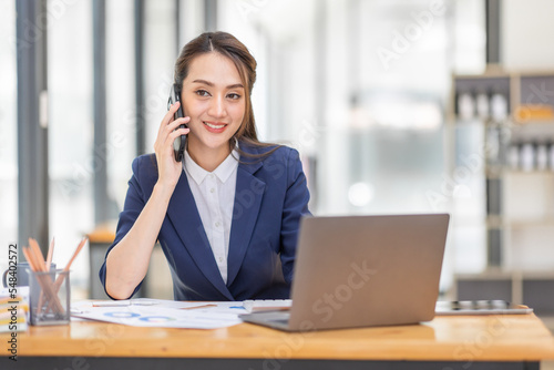 Shot of a asian young business Female working on laptop computer in her workstation.Portrait of Business people employee freelance online marketing Call phone e-commerce telemarketing concept.
