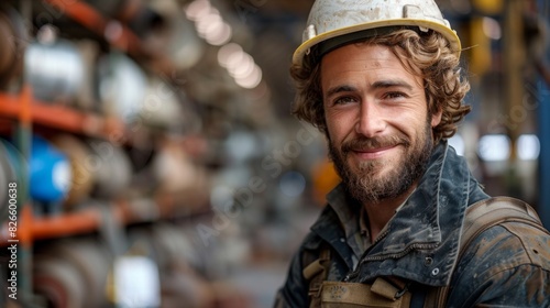 Shot of a handsome young bearded factory worker in uniform holding protective hardhat smiling joyfully to the camera posing