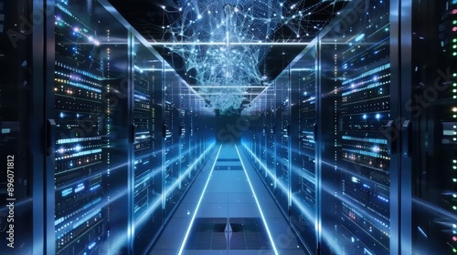 Shot of Corridor in Working Data Center Full of Rack Servers and Supercomputers with Internet connection Visualization Projection, technology, digital, futuristic, future,