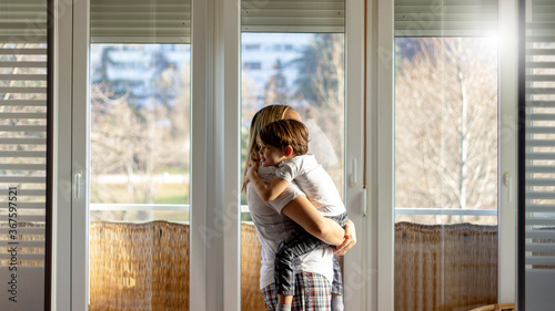 Shot of loving mother carrying her boy at home.Rear view portrait of family on balcony looking through the window.Shot of single mother and her adorable little son looking out the window at home.